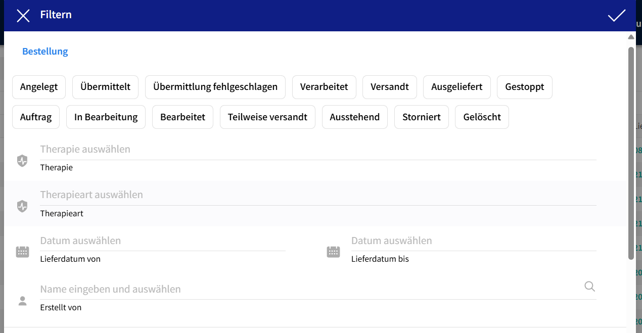 - Therapie- und Therapieart: die Bestellungen können nach einer bestimmten Therapie und Therapieart durchsucht werden.