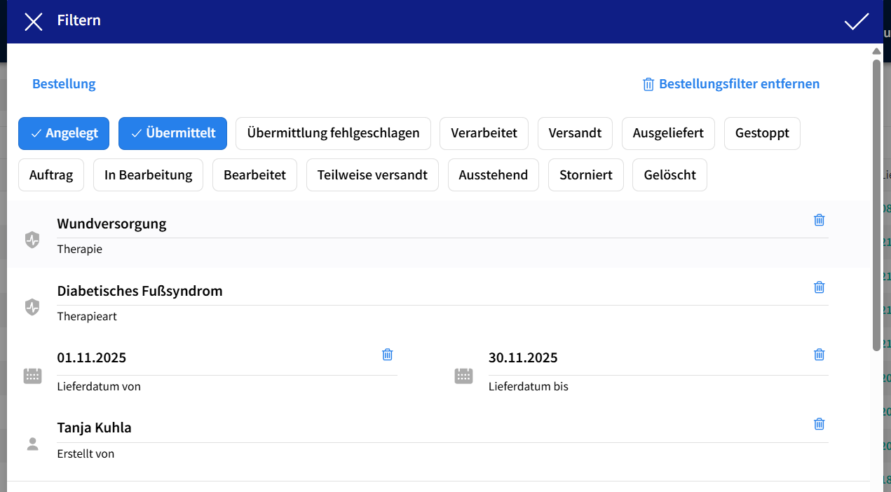 - Erstellt von: die Bestellungen können nach der Person, welche die Bestellung erstellt hat, abgefiltert werden (bitte nicht verwechseln mit dem zugeordneten Außendienst am Patienten).