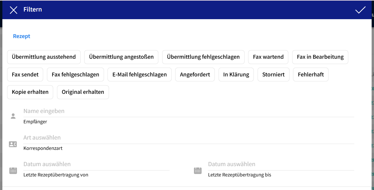 - Rezeptstatus: es kann aus den zur Verfügung stehenden Rezeptstatus ausgewählt werden, eine Mehrfachauswahl ist hier möglich. Per Klick auf den entsprechenden Status-Button werden diese ausgewählt.