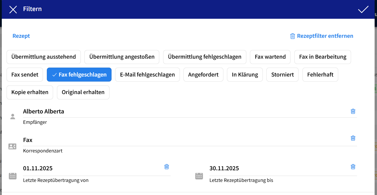 - Empfänger: hier kann nach dem Empfänger (=Arzt) der Rezeptanforderung gesucht werden. Wird danach abgefiltert, werden nur noch Bestellungen mit Rezeptanforderungen an diesen Arzt angezeigt.