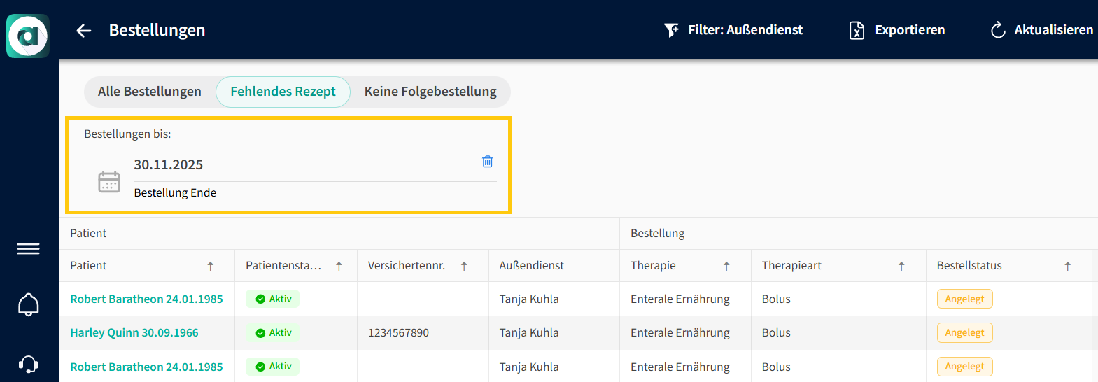- Außendienst: wird hier eine Auswahl getroffen, werden alle Bestellungen der Patienten angezeigt, denen der Außendienstmitarbeiter zugewiesen ist. So kannst du z.B. nach all deinen Bestellungen suchen.