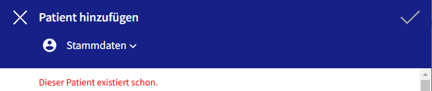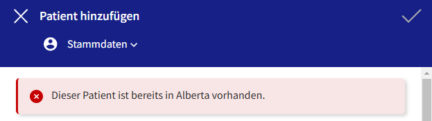 - Wird in Alberta versucht, ein Patientenduplikat anzulegen (gleicher Vorname, gleicher Nachname und gleiches Geburtsdatum) wird eine Fehlermeldung angezeigt.