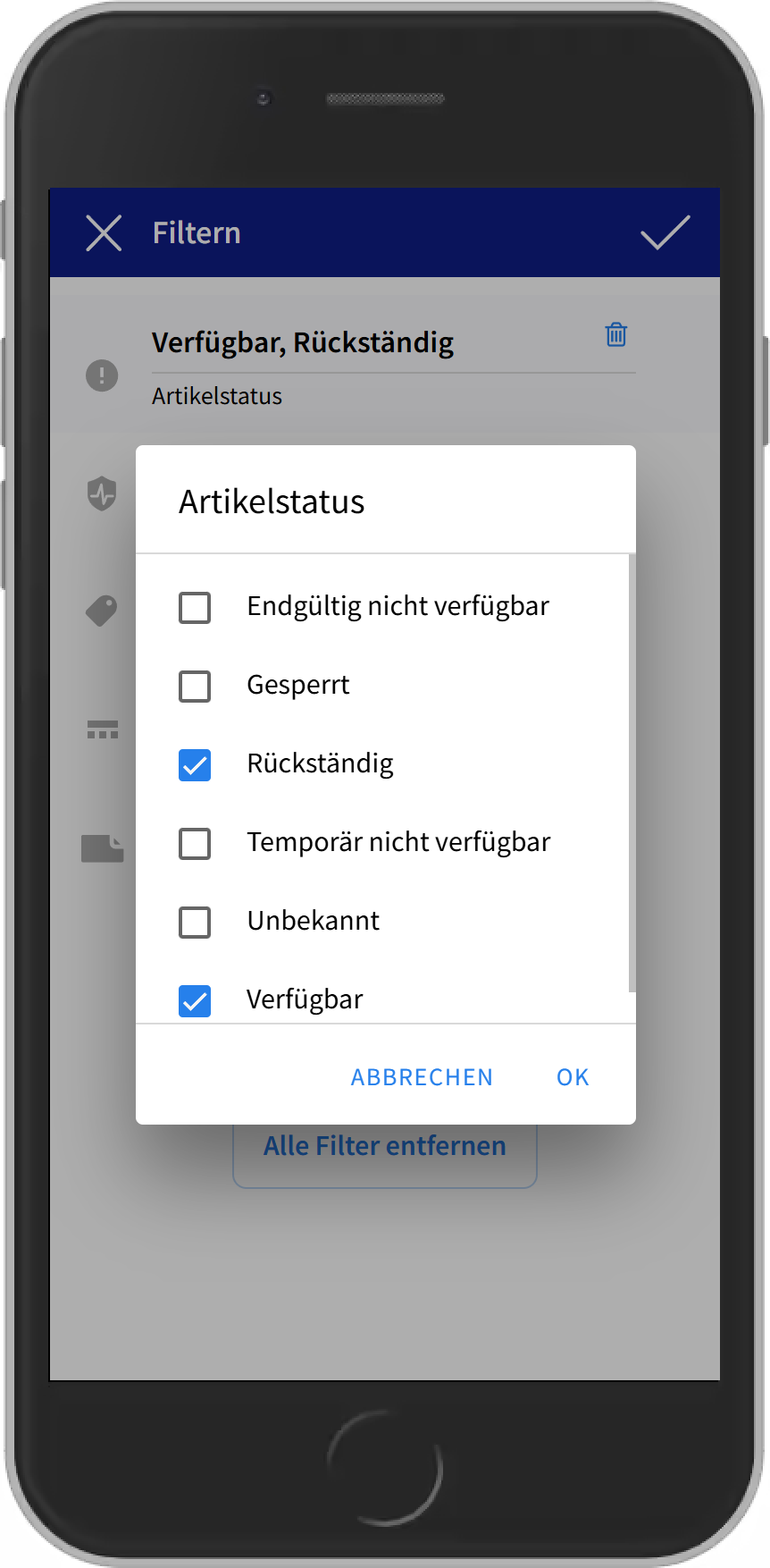 - Mit dem Update haben wir eine Filterfunktion für die Artikelliste eingeführt. Der Filter ist standardmäßig aktiv und zeigt alle verfügbaren (und rückständigen) Produkte an. Nicht verfügbare Produkte werden standardmäßig über den Filter ausgeschlossen.