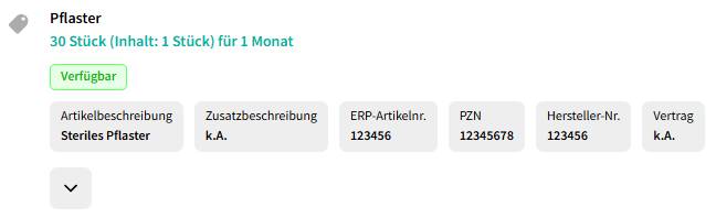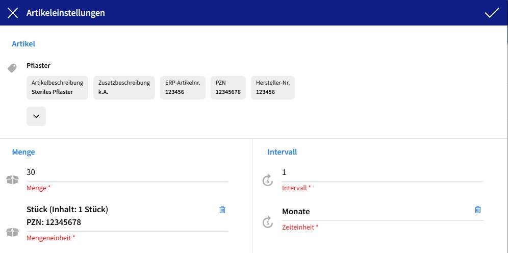 - In unserem Beispiel haben wir ein Pflaster und definieren, dass 30 Stück pro Monat verbraucht werden (Menge: 30 Stück / Intervall: 1 Monat)