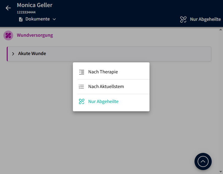 • Wird eine Wundlokalisation mit "Abgeheilt" markiert, werden alle, zu der Wundlokalisation zugehörigen Dokumente, in den Abschnitt "Nur Abgeheilte" verschoben.