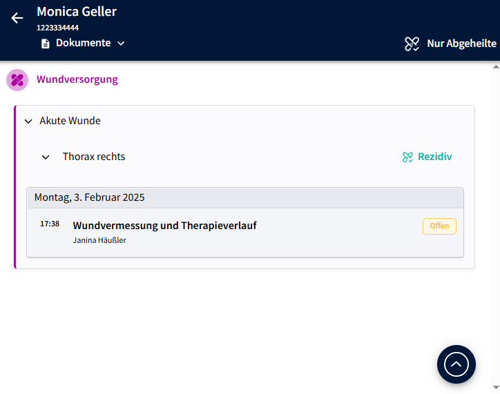• Ist die Wunde wiederkehrend, kann die gesamte Dokumentation mit Klick auf "Rezidiv" zurück in die Standardansicht verschoben werden (natürlich auch, wenn es kein wirkliches Rezidiv sondern ein Versehen ist).