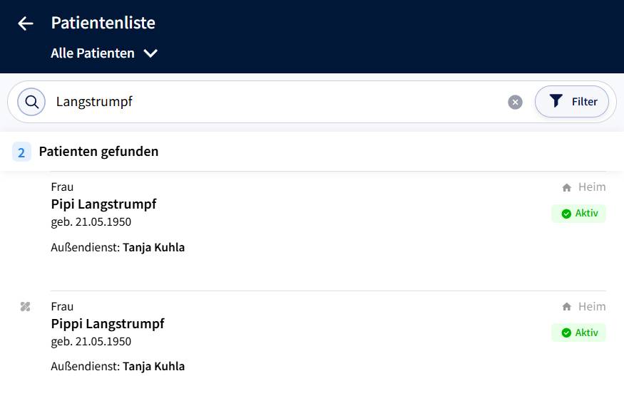 Die Duplikate können einfach zusammengeführt werden, alle zugehörigen Daten (Dokumente, Versorgungen usw.) werden dann auf den korrekten Patientendatensatz zusammengefasst.