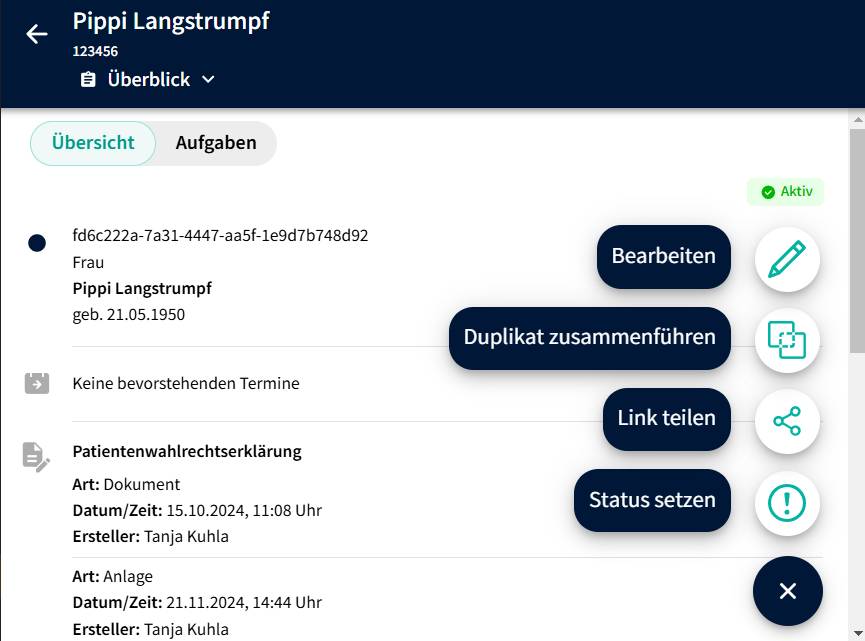 Als nächstes gehen wir in die Patientenakte des korrekten Datensatzes, hier gibt es die Aktion "Duplikate zusammenführen".
