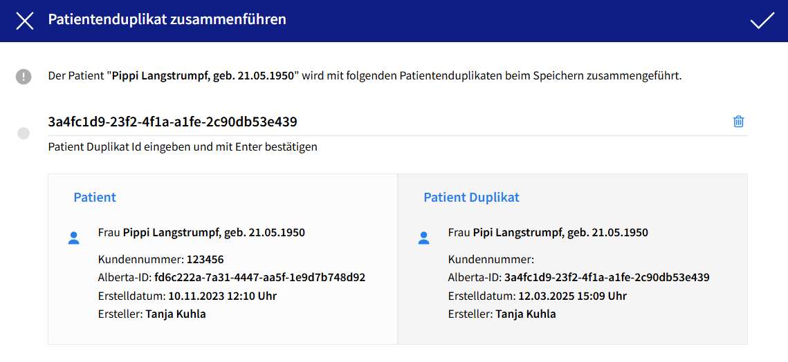 Mit Klick auf die Aktion öffnet sich ein Dialog "Patientenduplikat zusammenführen".