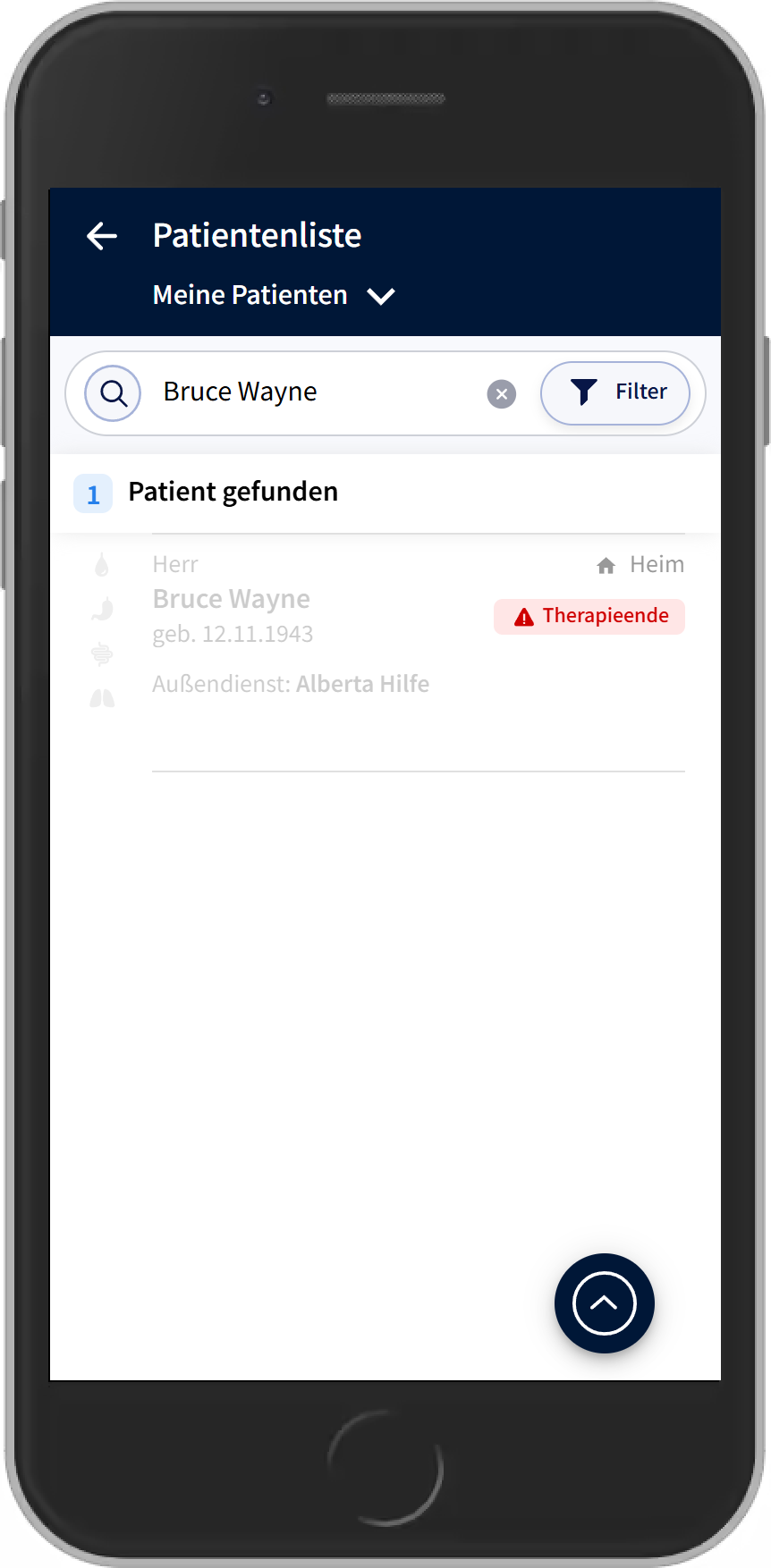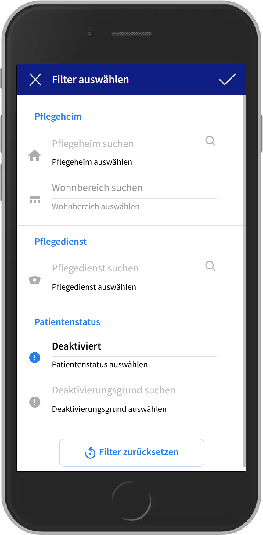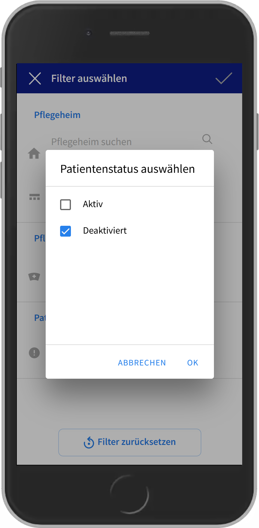 • Dafür einfach auf den Filter gehen, bei Patientenstatus "Deaktiviert" auswählen und speichern.