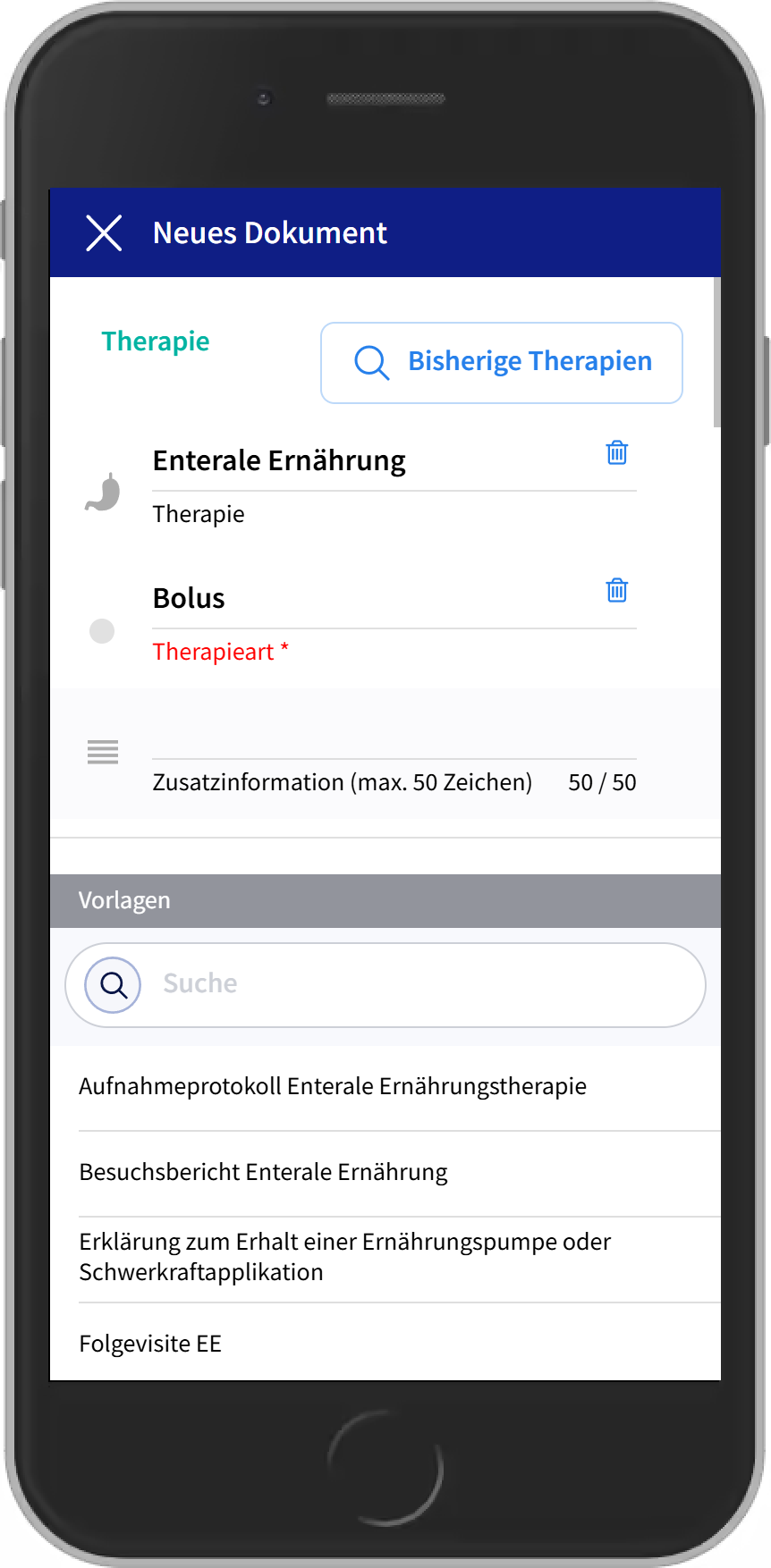 • Beim Hinzufügen von neuen Dokumenten und Versorgungen gibt es nun die Möglichkeit, auf bereits verwendete Therapien (und Therapiearten) zuzugreifen.