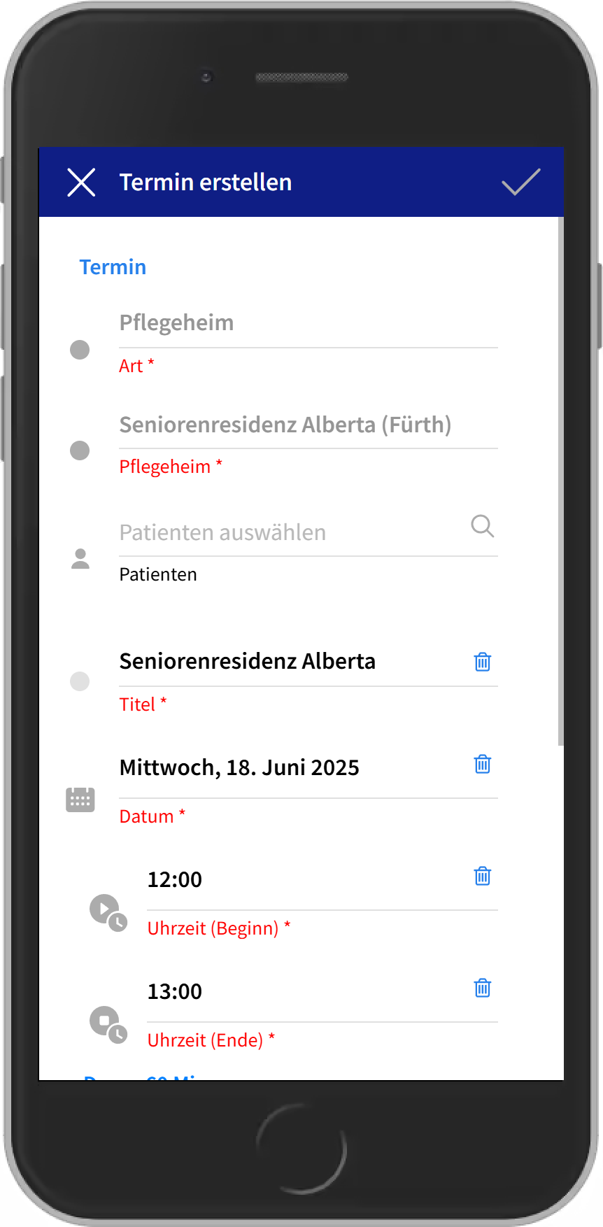 • So können z.B. bei Pflegeheimen allgemeine Termine erstellt werden, die keinen Patientenbezug haben.