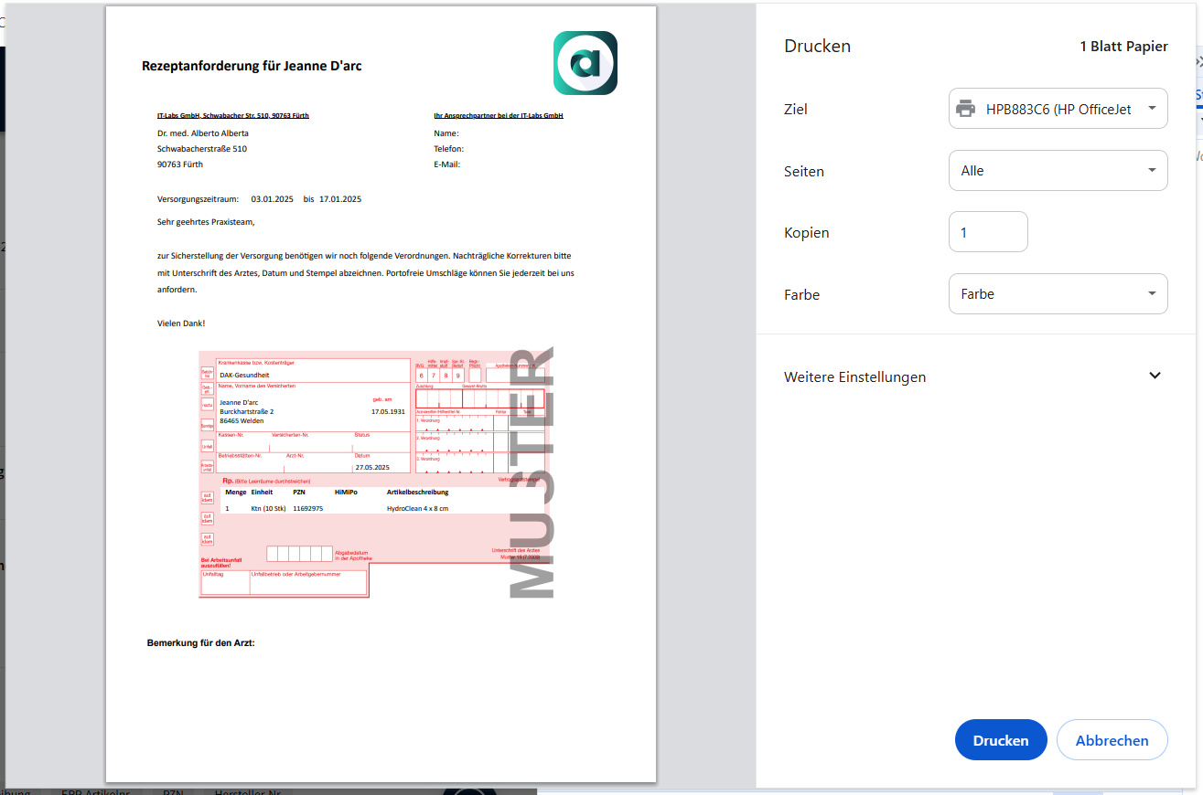• Nach dem Speichern der Rezeptanforderung erscheint der Druckdialog des Browsers und der Rezeptstatus wird auf "Angefordert" gesetzt.