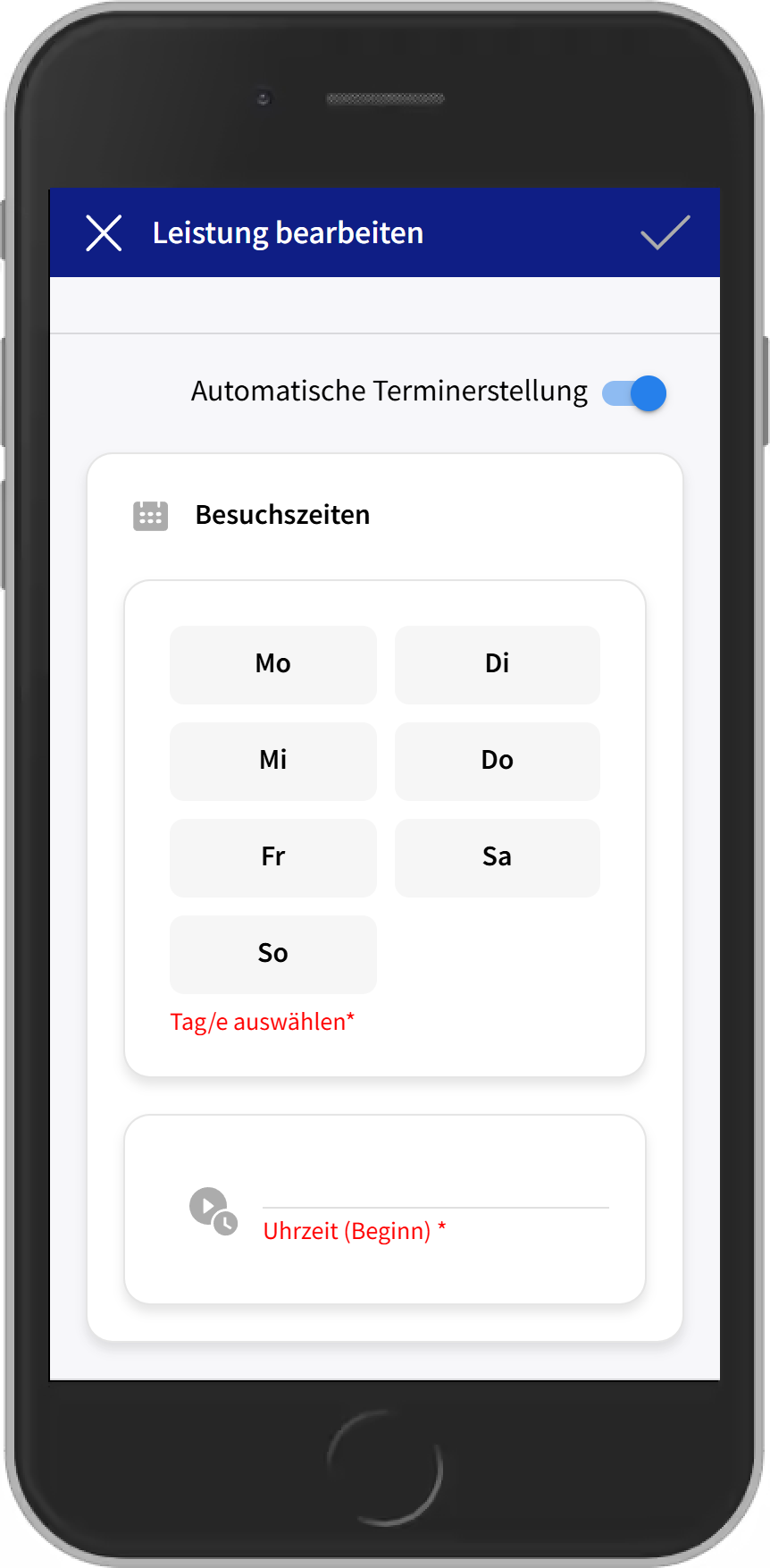 • Wird diese Einstellung aktiviert, können wie gehabt die Besuchszeiten eingegeben werden und die Terminerstellung erfolgt automatisch.