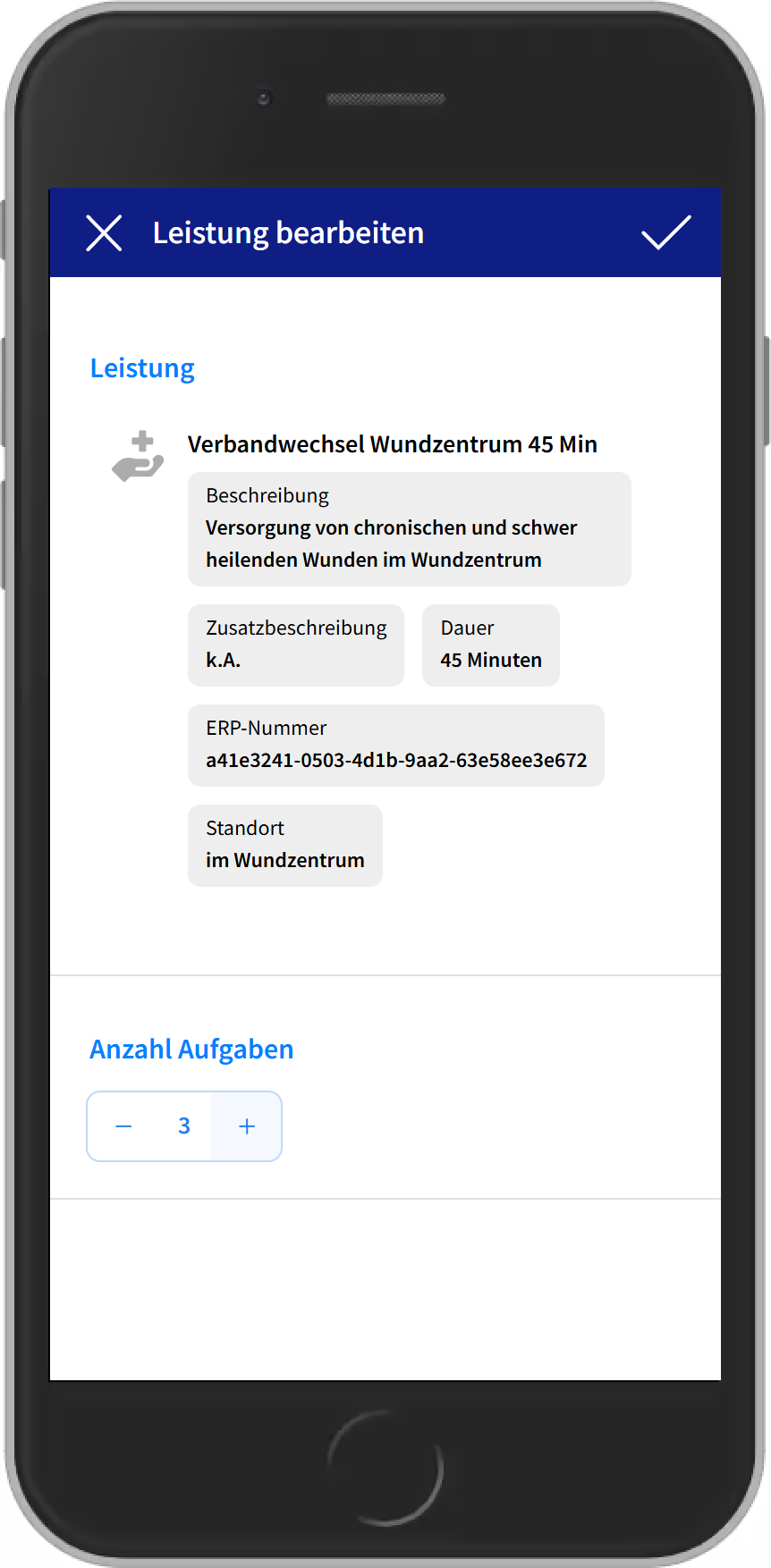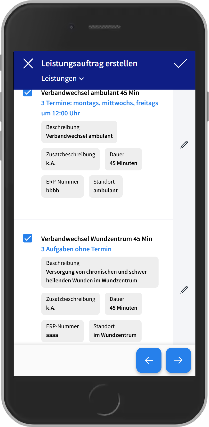 • Zum Vergleich sehen wir hier zwei Leistungen im Leistungsauftrag: Verbandwechsel ambulant (mit automatischer Aufgaben- und Terminerstellung) und  Verbandwechsel Wundzentrum (ohne automatisch angelegte Aufgaben und Termine)