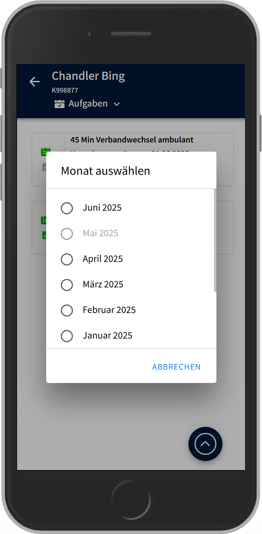 • Soll in Alberta im Abschnitt "Aufgaben" in der Patientenakte der Leistungsnachweis festgschrieben werden, wurden bisher im Auswahldialog "Monat auswählen" nur vier Monate angezeigt (der aktuelle Monat und die letzten drei vergangenen Monate).