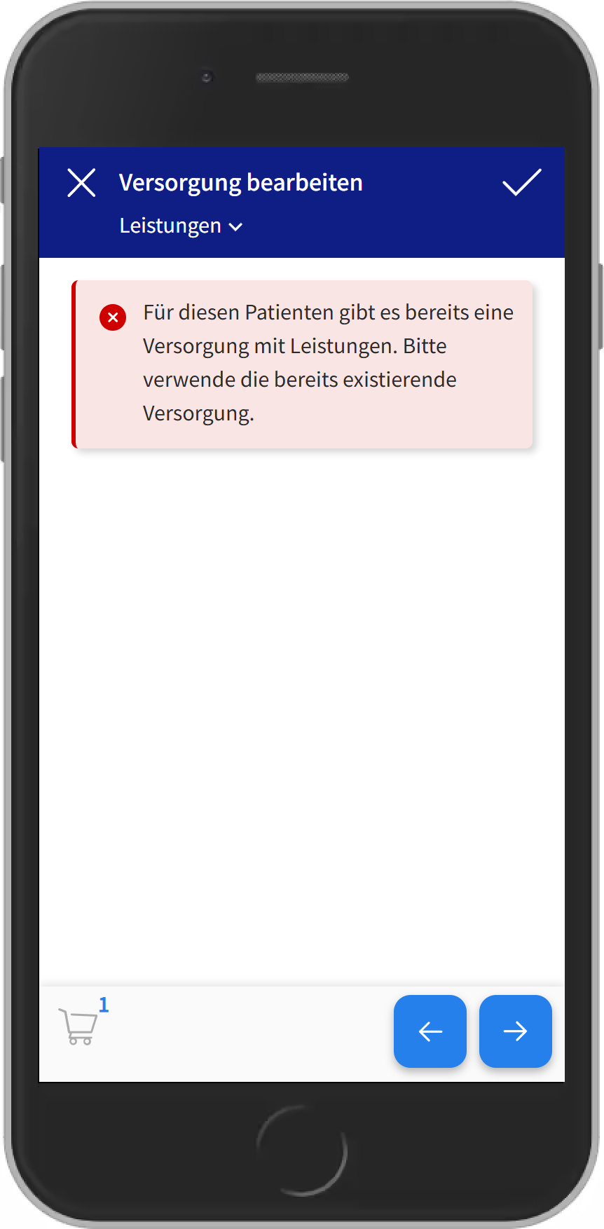 • Wenn eine weitere Versorgung angelegt wird erscheint ein Hinweis und es können keine weiteren Leistungen hinzugefügt werden.