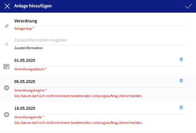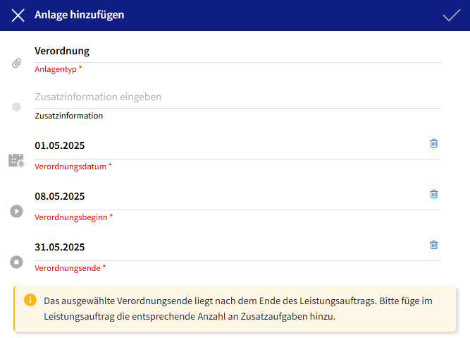 Werden im Leistungsauftrag Verordnungen als Anlage hochgeladen, kann dort nochmal der Verordnungszeitraum angepasst werden. Wir haben hier zwei Anpassungen durchgeführt.