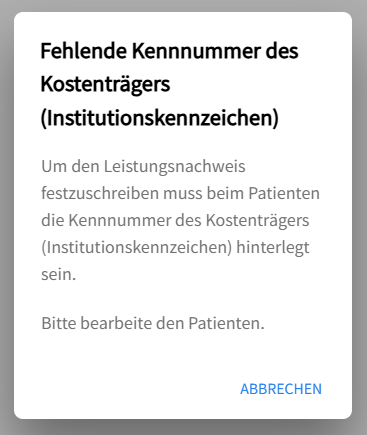 • Wird bei einem Patienten ohne IK-Nummer versucht, ein Leistungsnachweis zu erstellen, erscheint folgende Fehlermeldung: