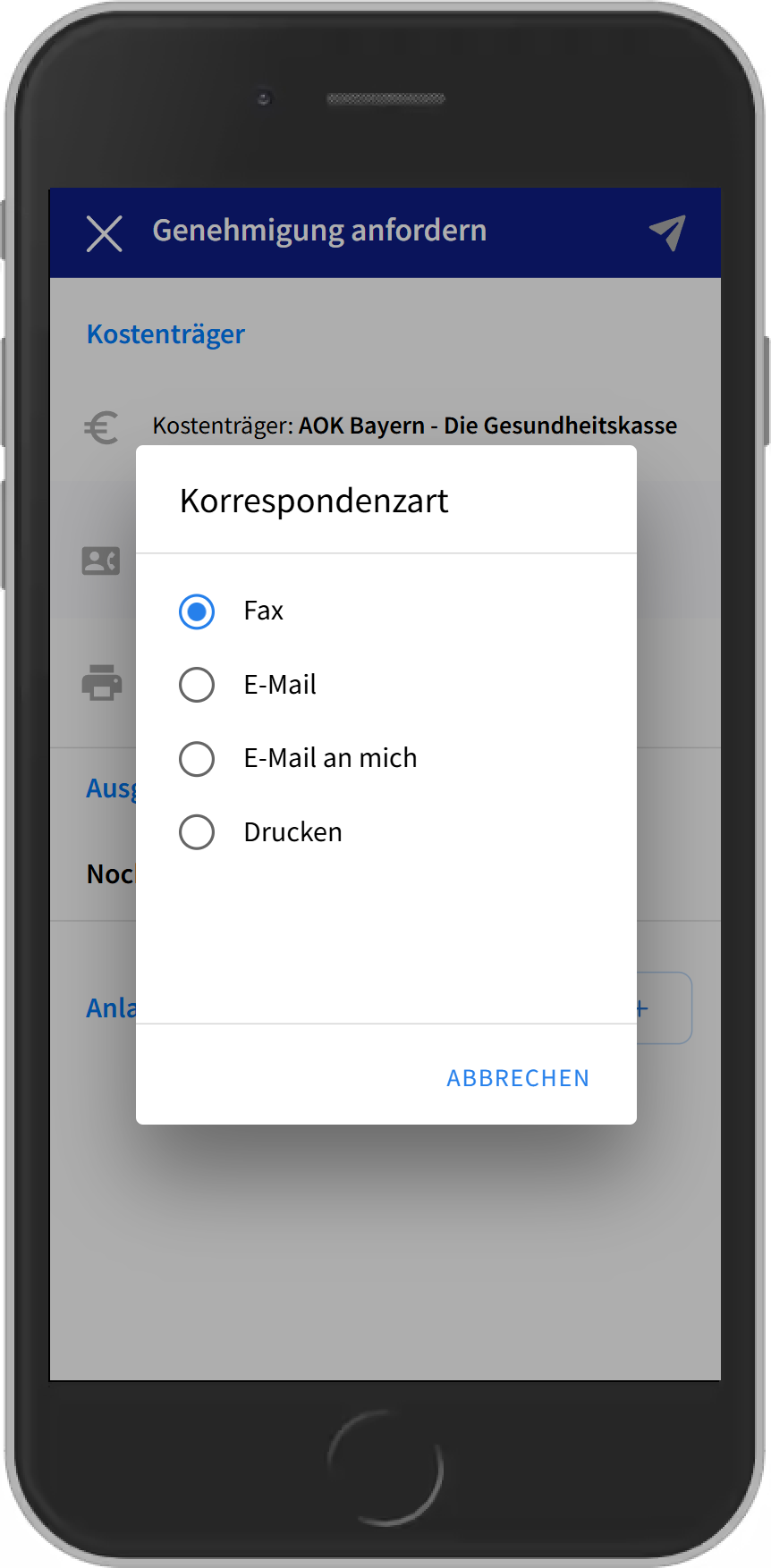 - Es erscheint die Auswahl der Korrespondenzart und es kann zwischen Fax, E-Mail, E-Mail an mich und Drucken gewählt werden.