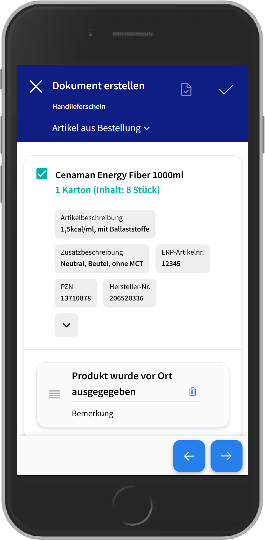 - In dem Bearbeiten-Dialog des Dokumentes werden alle Artikel aus der Bestellung augelistet. Diese können ab- und angewählt werden, zudem kann eine Bemerkung pro Artikel definiert werden.