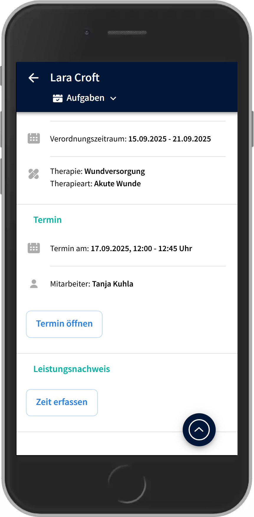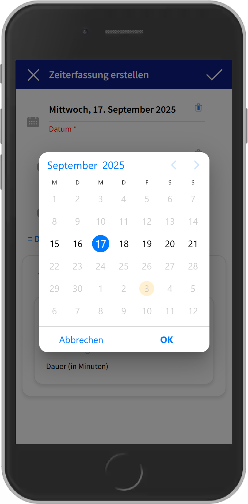 - Beispiel: die Aufgabe bei der Patientin Lara Croft ist für den 17.09.2025 terminiert. Der Verordnungszeitraum ist vom 15.09.-21.09.2025. Somit kann die Zeiterfassung auch nur noch in diesem Zeitraum stattfinden, es ist nicht möglich ein Datum außerhalb dieses Zeitraums auszuwählen.