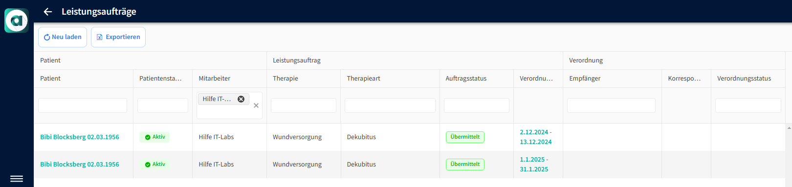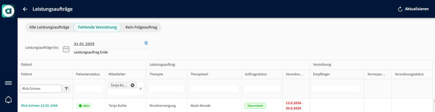 - "Fehlende Verordnung": Anzeige aller Leistungsaufträge, bei denen noch keine Verordnung hinterlegt ist. Die Anzeige wird durch das Enddatum der Leistungsaufträge eingeschränkt. Voreingestellt ist hier immer der letzte Tag des aktuellen Monats.