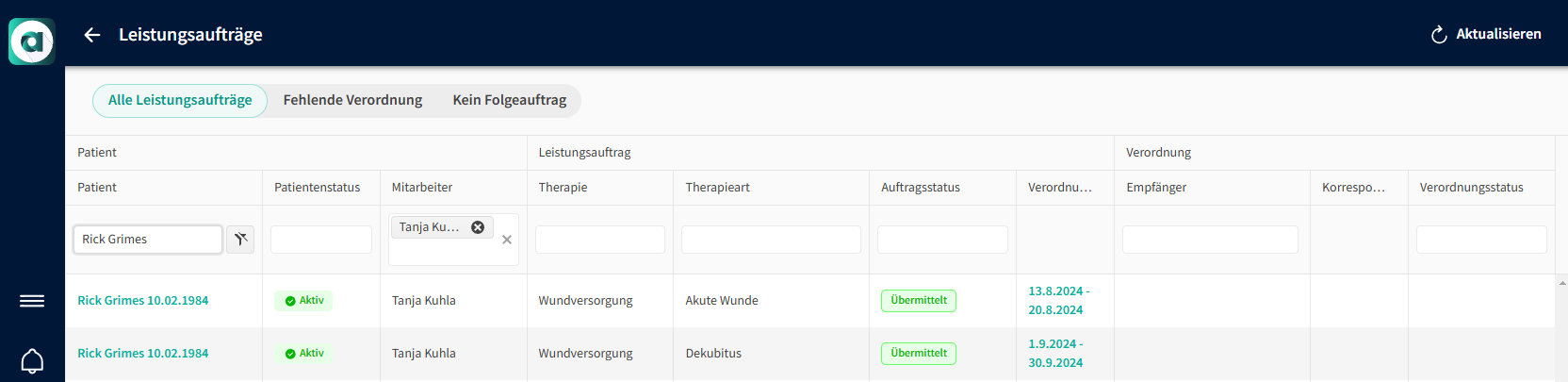 - "Kein Folgeauftrag": Anzeige aller Leistungsaufträge, bei denen kein Folgeauftrag existiert. Ist der Patient deaktiviert oder die Versorgung inaktiviert (weil abgeschlossen), verschwinden die Einträge ebenfalls aus der Anzeige.
