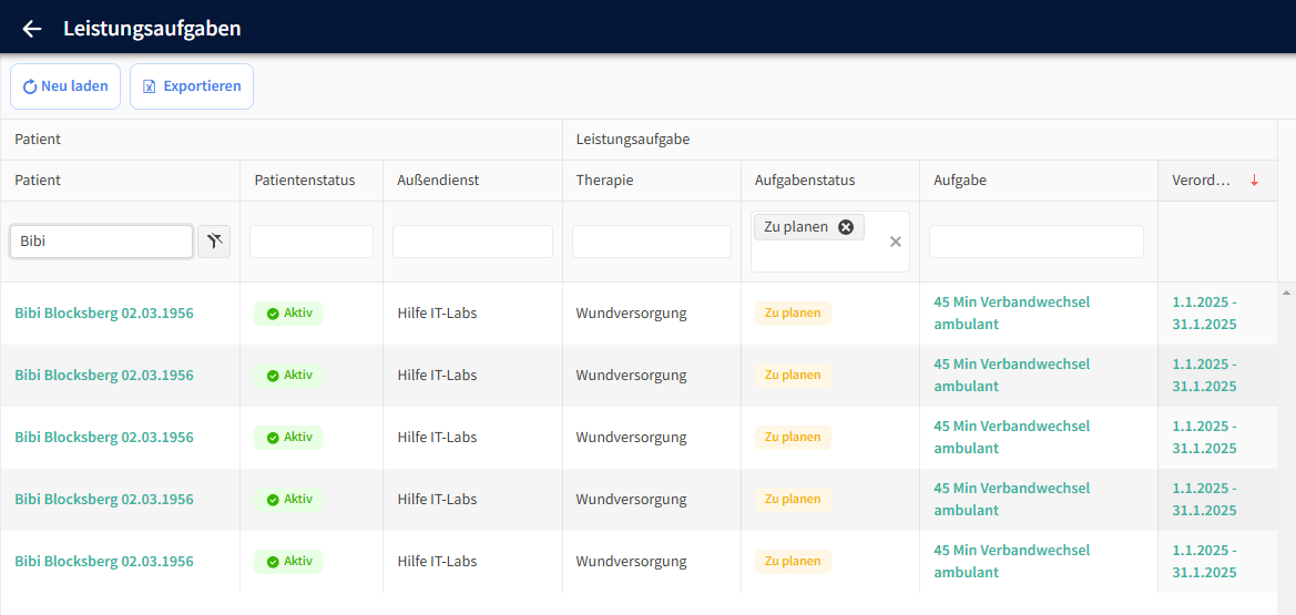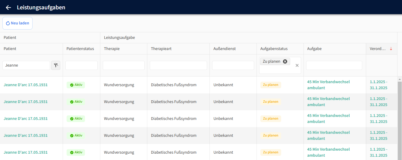 - Bisher wurde in der Liste "Leistungsaufgaben" immer der zugehörige Außendienst-Mitarbeiter des Patienten angezeigt (siehe Bild 1).