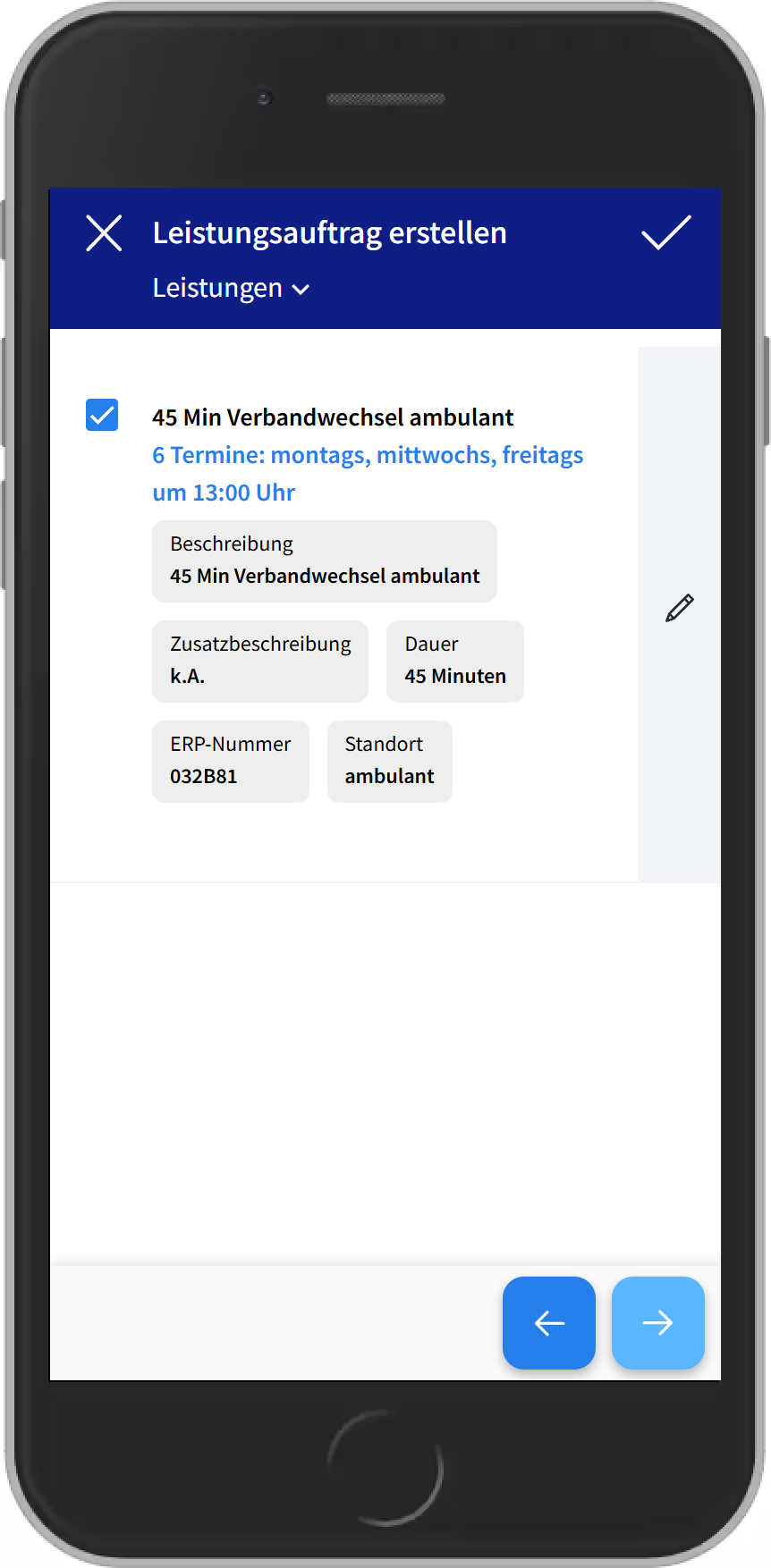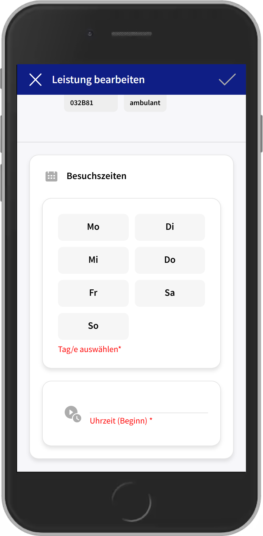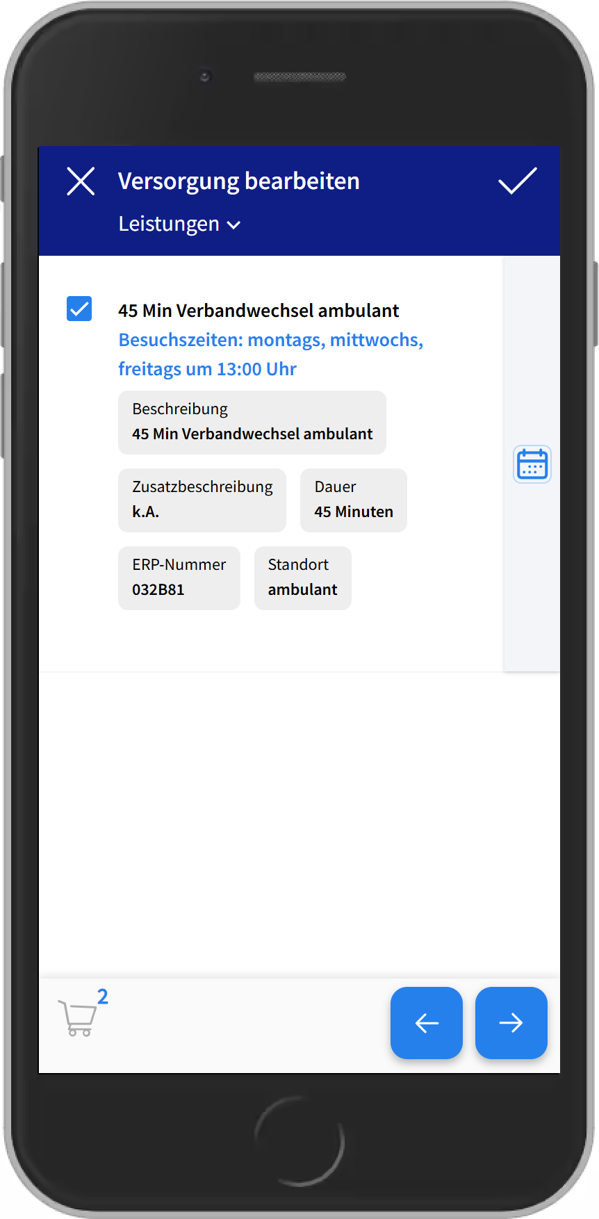 - 1) Beim Bearbeiten der Versorgung über das Kalender-Icon rechts die Leistung bearbeiten und die Besuchszeiten auswählen. Dafür einfach die gewünschten Tage anklicken und eine Uhrzeit eingeben.