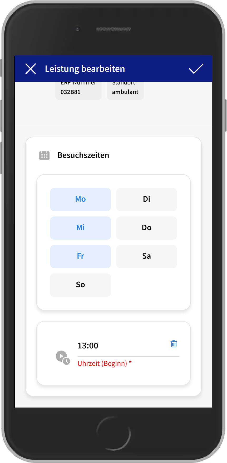 - 2) Die ausgewählten Besuchstage werden farblich hervorgehoben. Nach dem Speichern werden die Besuchszeiten im Bearbeiten-Dialog der Versorgung angezeigt: