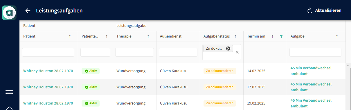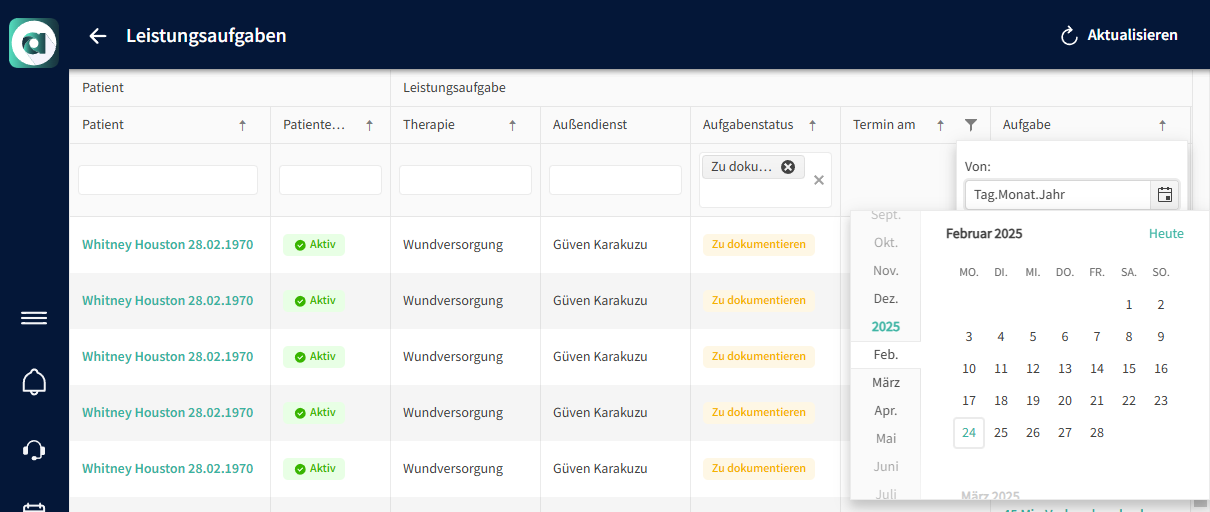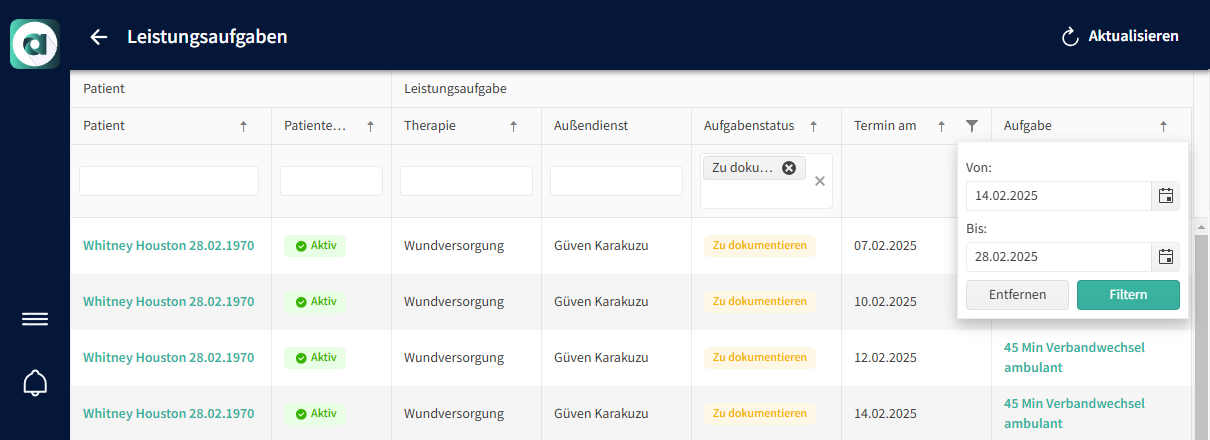Filterung nach Terminen in der Liste "Leistungsaufgaben"