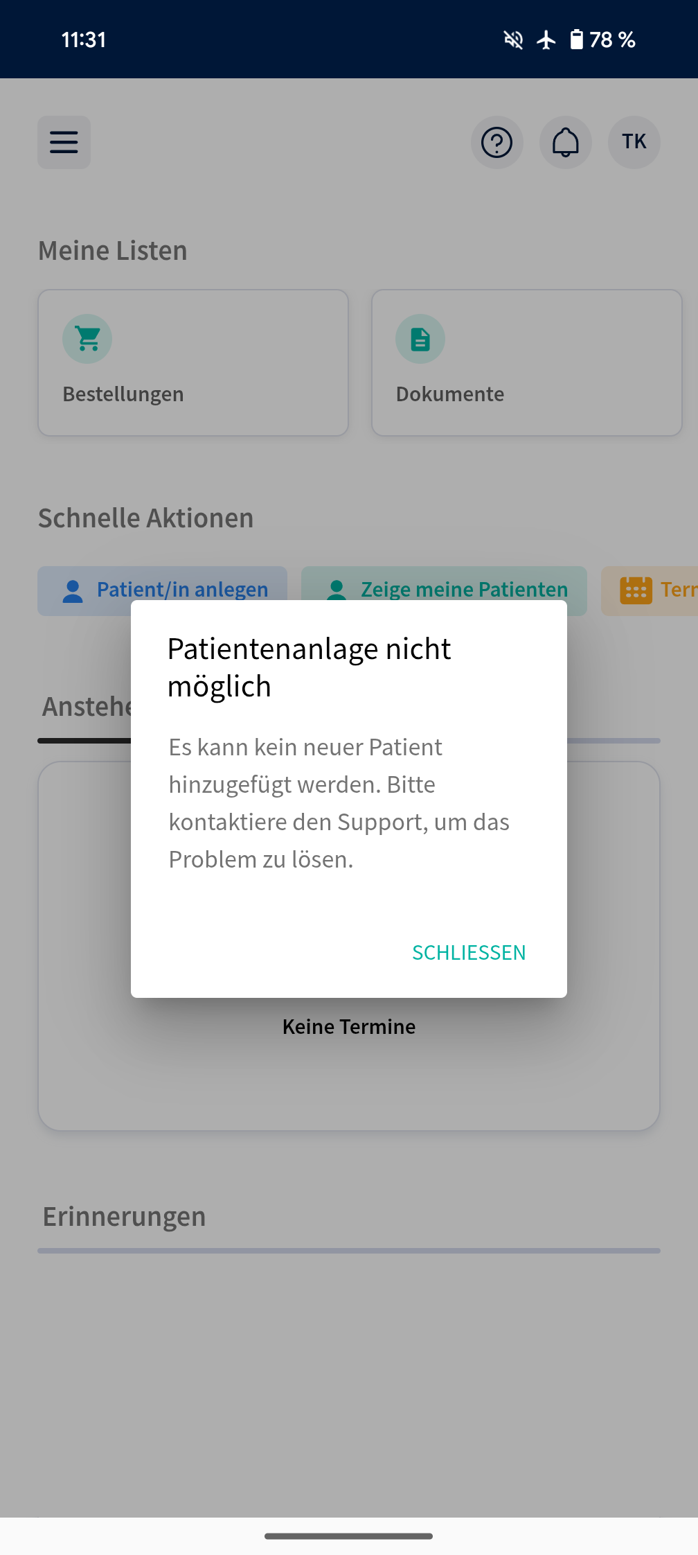 • Der Dialog schließt sich nun automatisch direkt wieder und eine Fehlermeldung "Patientenanlage nicht möglich" wird angezeigt mit Bitte, den Support zu kontaktieren.