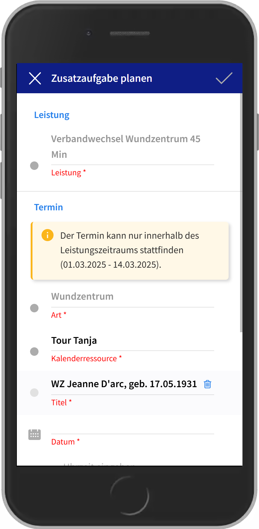 Dafür einfach in der Detailansicht des Leistungsauftrags die Aktion "Zusatzaufgabe planen" auswählen und eine Aufgabe inkl. Termin planen.