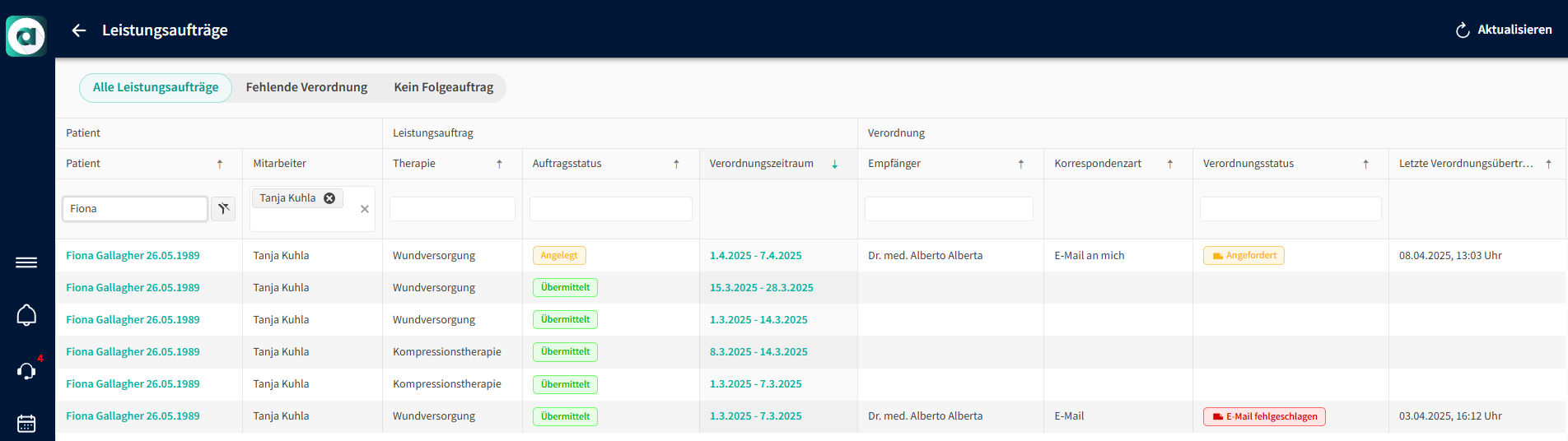 - In der Listenansicht der Leistungsaufträge gibt es eine neue Spalte: die letzte Verordnungsübertragung.