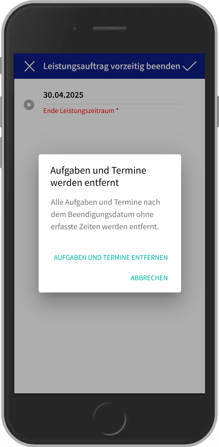 - Das ursprüngliche Ende des Leistungszeitraums kann so angepasst werden und nach dem Speichern werden alle zugehörigen Aufgaben (inkl. Termine), die über den Zeitraum des neuen Enddatums hinausgehen, automatisch gelöscht.