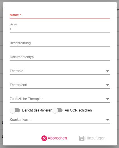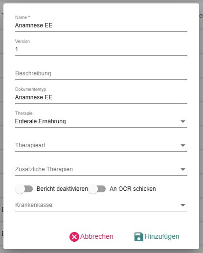 - Zusäztliche Therapien: Soll die Dokumentenvorlage für mehrere Therapien angezeigt werden, können hier zusätzlich weitere Therapien ausgefüllt werden.