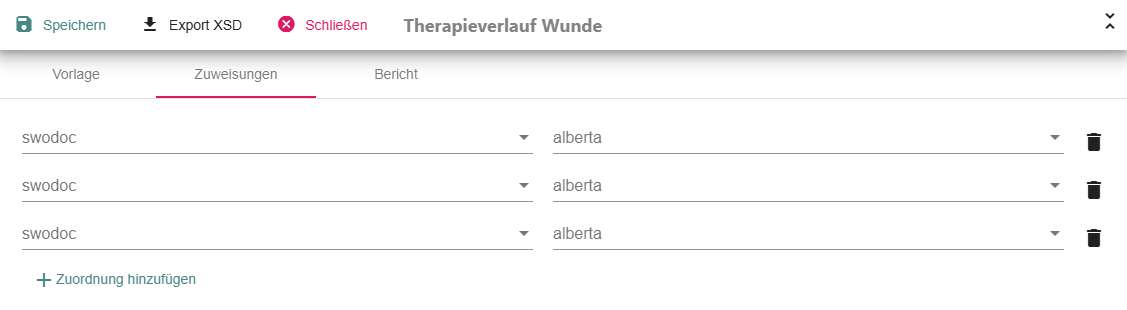 • Es wird eine neue Zeile hinzugefügt mit je einer Auswahl von "swodoc" (= Bezug zum Formulargenerator) und "alberta" (= Bezug auf die Patientendaten in Alberta