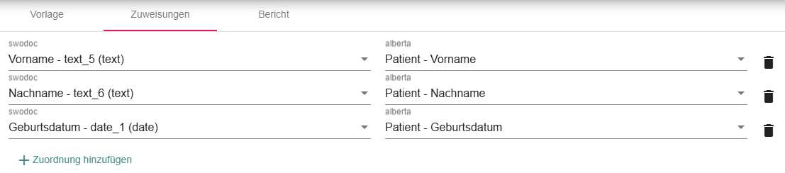 • Wichtig: eine Zuweisung niemals leer lassen! Sollte diese doch nicht benötigt werden, einfach löschen (über das Mülleimer-Symbol ganz rechts) - wird diese nämlich (vollständig oder teils) leer gelassen, versucht Alberta verzweifelt eine Zuweisung beim Erstellen des Dokuments herzustellen und das Dokument kann nicht geladen werden .