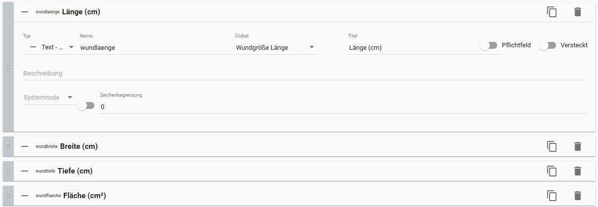 - Fläche ("wundlaenge" bei Name und Auswahl "Wundgröße Länge" bei Global)