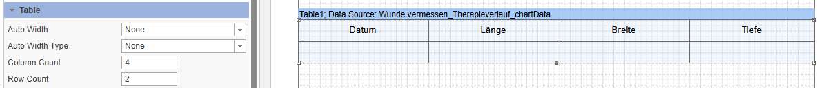 - Tabelle anpassen (Column Count: 4; Row Count: 2; Header Rows Count: 1)