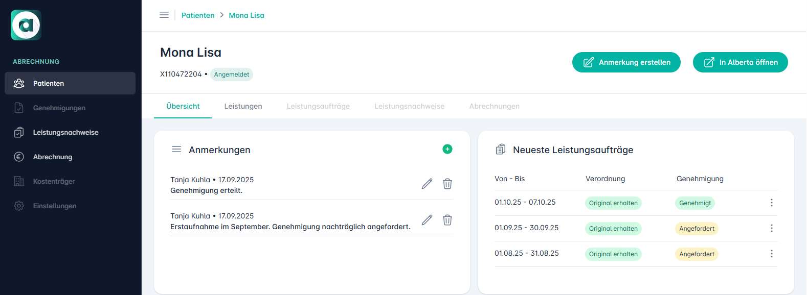 - Eine ausführliche Dokumentation zu diesem neuen Feature findest du hier: https://tickets.halloalberta.de/help/de-de/43-abrechnungsportal/143-leistungen-prufen-im-patienten