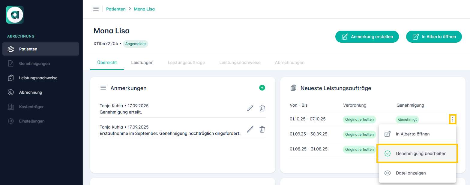 - Dafür einfach im Patienten beim entsprechenden Leistungsauftrag auf die drei Pünktchen klicken und die Aktion "Genehmigung bearbeiten" anklicken: