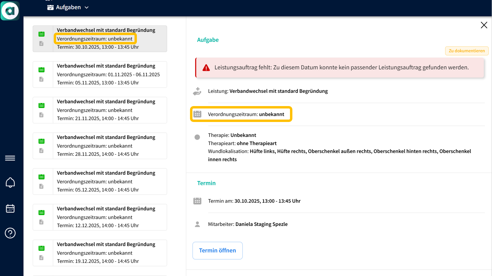 Findet sich kein passender Leistungsauftrag zum Termin, wird dies explizit durch eine Warnung angezeigt.