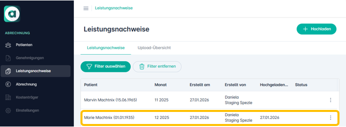 Neuerung: Im Profil jedes Patienten finden Sie nun einen eigenen Reiter "Leistungsnachweise". Dieser zeigt Ihnen die gewohnte Liste aller Nachweise direkt im Kontext des Patienten an. Die Darstellung (Spalten, Design) entspricht der bekannten Ansicht, wobei die Liste automatisch auf den aktuellen Patienten vorgefiltert ist.