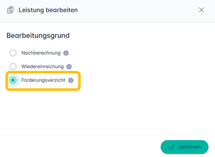 Neuerung: Sie können bereits abgerechnete Leistungen im Bearbeitungs-Dialog nun explizit als "Forderungsverzicht" markieren.