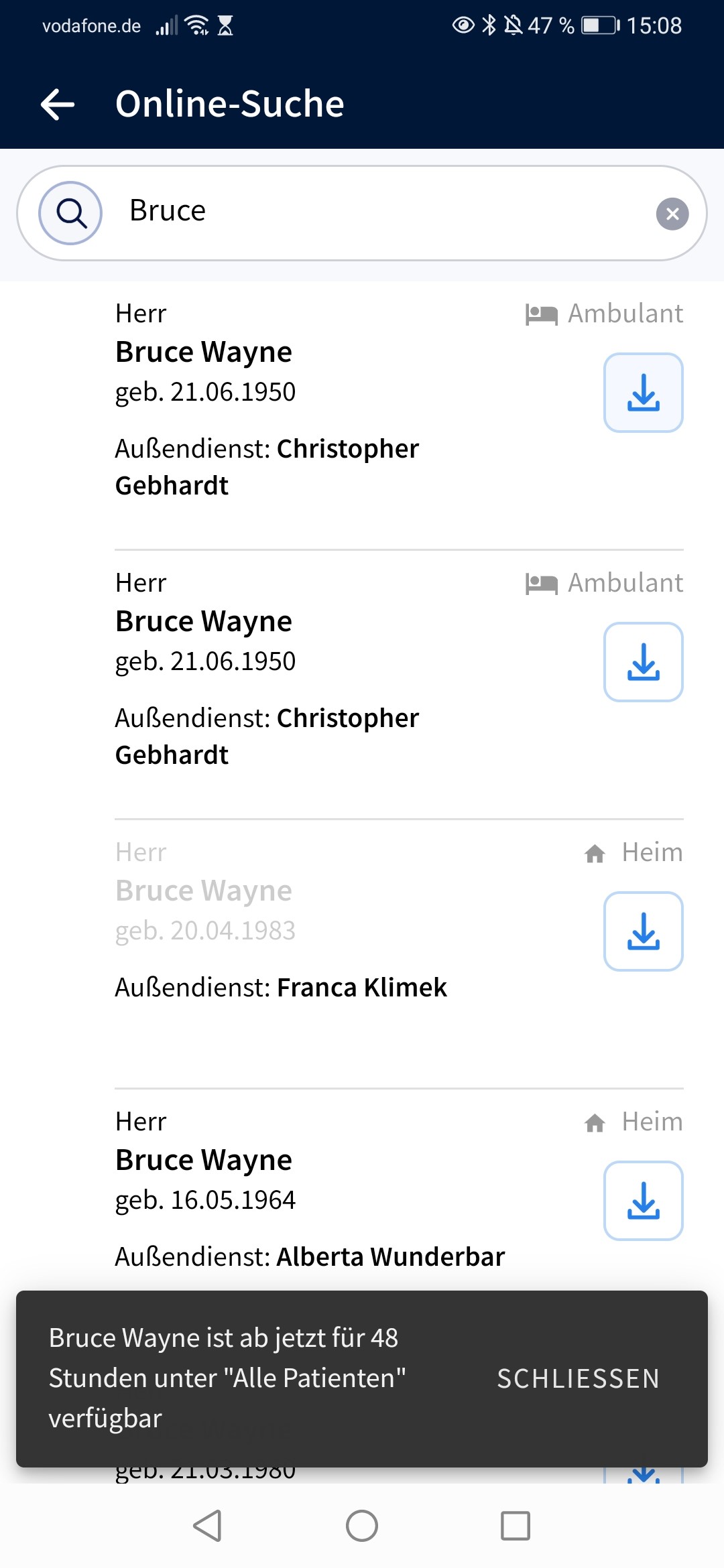 - Ist der Patient fertig herunter geladen, erscheint ein Hinweis "Der Patient ist ab jetzt für 48 Stunden unter "Alle Patienten" verfügbar" - Grund hierfür: wir können zwar alle deine Änderungen am Patienten speichern, aber keine neuen empfangen, da der Patient nur lokal bei dir auf deinem mobilen Endgerät ist!