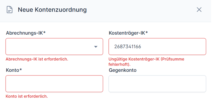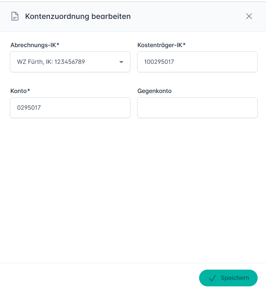 - Konto: Die in Ihrem Buchhaltungssystem (DATEV) hinterlegte Kontonummer für diesen Kostenträger und der Abrechnungs-IK.