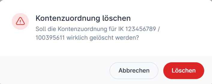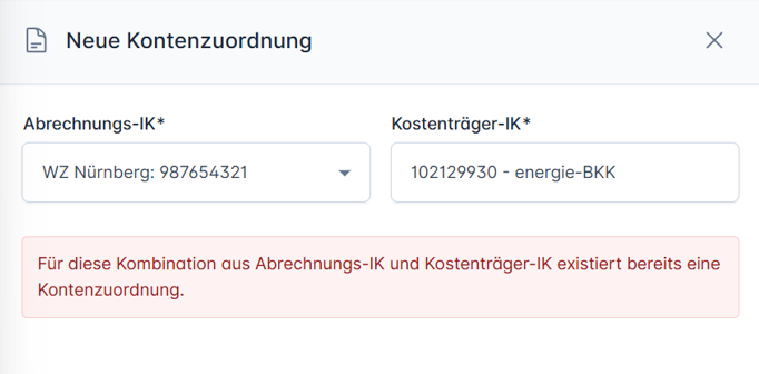 - Vermeidung von Doppelanlagen: Das Alberta Portal prüft die Kombination aus Abrechnungs-IK und Kostenträger-IK. Existiert für diese Kombination bereits eine Zuordnung, erscheint eine Fehlermeldung und die Anlage wird blockiert.