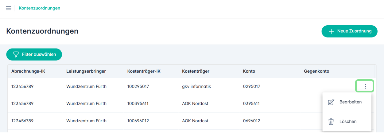 Sollten sich Kontonummern ändern oder Zuordnungen fehlerhaft sein, können diese über das Drei-Punkte-Menü am rechten Rand jeder Zeile verwaltet werden.